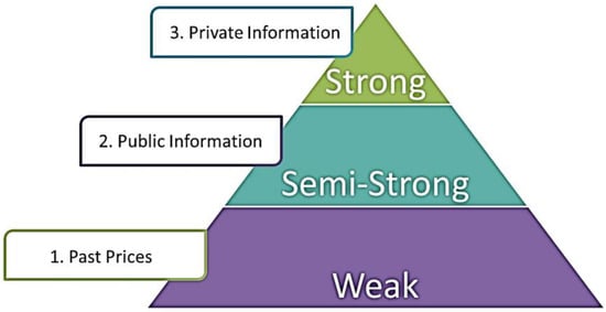 According to (), the EMH gained immense popularity during the 1980s. E. Fama, a U.S. economist, became a classic in this field and his work was pioneering for efficient markets. He claimed that the evidence in favour of the EMH was strong, and that it could be only neglected if it was empirically tested on a large scale (). The work of H. Roberts went in a new direction, where he divided efficient markets into strong and weak forms. Later on, () further extended this division and added a semi-strong form of efficiency. By considering this extension in the division, the flow of information, and its impact on the market price of stocks, market efficiency was divided into three parts. The three basic types of market efficiency are mentioned in Figure 1.