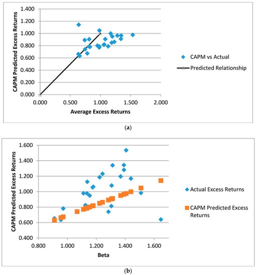 During the period from 1980 to 1990, CAPM was heavily criticised, due to the discovery of several anomalies. These anomalies provided a challenge for CAPM: to prove that market beta was sufficient to explain expected stock returns. Some of the renowned anomalies discovered during this period (e.g., leverage, a book-to-market value of equity ratio, earnings-to-price ratio, and so on ()) found that, when stocks were sorted according to earnings-to-price ratio, stock returns of high E/P ratio were higher than the prediction of CAPM. () found the size effect and observed that stocks with low market value earned higher returns than the predictions of CAPM, which meant that small stocks have a higher beta and higher expected returns than those captured by CAPM. () argued that leverage has a positive relationship with expected stock returns and that the proxy of leverage is the book value of the debt-to-market value of equity. Figure 3a shows an average excess return of the FF 25 (Fama and French portfolios ranked on size and book-to-market) against the average excess return one would expect given beta. Empirically observed excess returns have no apparent relationship to the CAPM-predicted excess returns. Figure 3b shows actual excess returns and CAPM expected excess returns against the estimated betas of the FF 25. Again, the CAPM did not explain the returns well. Furthermore, a closer review specifies that small-growth and small-value portfolios severely mismatch CAPM.