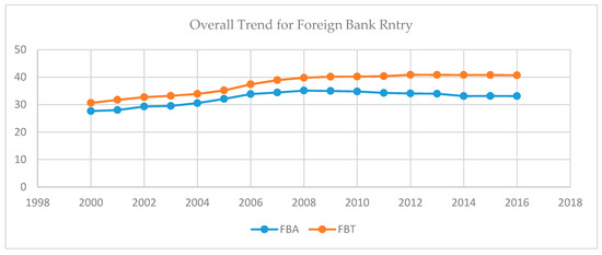 Overall trend of foreign bank entry across the globe. From 2000 to 2016, the banking system in different countries experienced essential transformations. The number of foreign banks and their assets has increased with time, which is also shown in Figure 1 and Figure 2. All of these different trends mean that the relative importance of the foreign banks increased extensively, from some foreign banks of an average of 30.62% in 2000 to 40.69% in 2016 (Figure 2): Source: Author’s calculation, World Bank Global Financial development database.