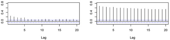 In Figure 1 and Figure 2, we provide the autocorrelation function for and for both the in-sample and out-of-sample. Both measures appeared to be rather persistent, which is also taken into account by time series modeling in Section 4.2.