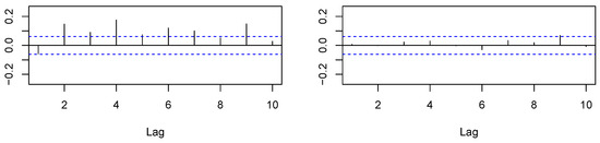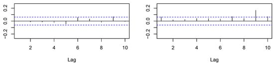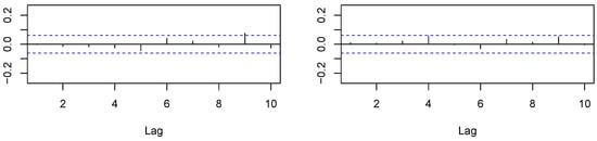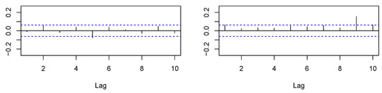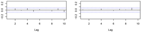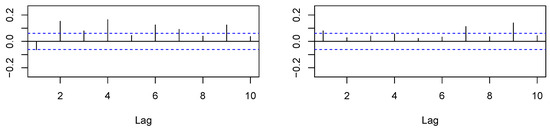 In Figure 6, Figure 7 and Figure 8, we show the in-sample residual ACFs. As for , in the case of , the ACFs for the HAR and AR(5) residuals showed no remaining autocorrelation, whereas for AR(1), there was still some autocorrelation left. The in-sample diagnostic test results are shown in Table 6. The HAR and AR(5) models for seemed to pass all the tests, whereas AR(1) residuals showed some residual autocorrelation.