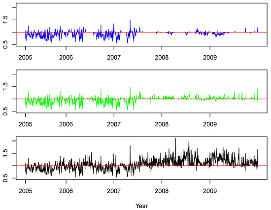 with , etc. The corresponding one-step-ahead forecasts are denoted as , , and . The HAR-type models in (13)–(15) are estimated by the OLS methodology in Section 4.