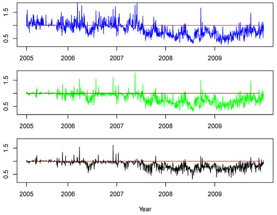 Ratios for the HAR, AR(5), and AR(1) models, from above to below. Note: the red lines correspond to a ratio of one, indicating equal variances.