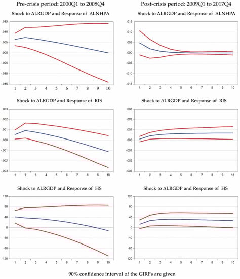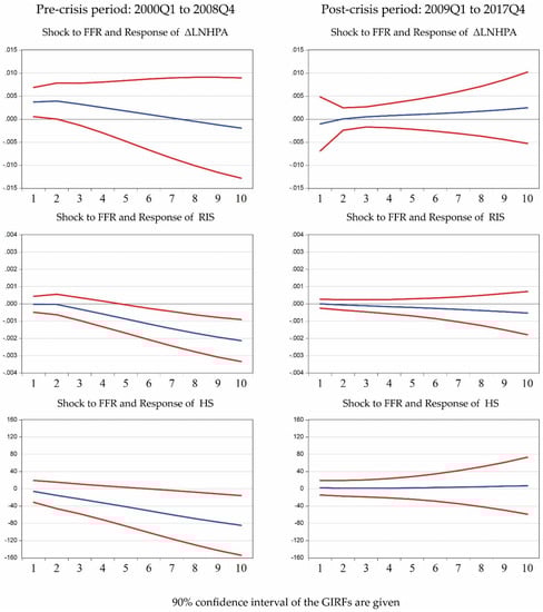 First, we estimate the VAR models for these sub samples. Using the Schwarz Information criteria (SIC) for lag selection9, we lag each of the three endogenous variables in the model by one quarter. Our estimated VAR models, given in Table A2, Table A3 and Table A4 in the Appendix A, show that the lagged value of federal funds rate does not have a significant impact on house prices in the pre-crisis period. However, it has a significant negative impact on the residential investment share at 1% level and housing starts at 10% level in the pre-crisis period. By contrast, we do not find the funds rate to be significant in explaining any of the three housing market variables in the post-crisis period. Instead, the lagged real GDP growth has a significant positive impact on the residential investment share and housing starts in the post-crisis period at 1% level and 5% level respectively.