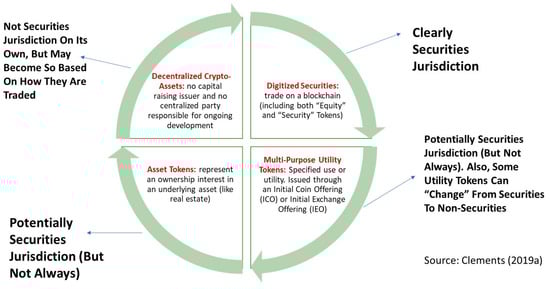 However, legal scholars have raised concerns about regulatory uncertainty with different types of crypto assets (Clements 2019a, 2019b). Digitized securities are clearly within the realm of securities regulation, while decentralized crypto-assets, asset tokens, and multi-purpose utility tokens are not necessarily within the realm of securities regulation, as graphically summarized by Clements (2019a) reproduced here in Figure 1.
