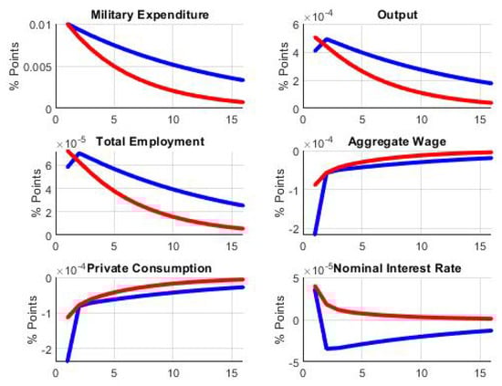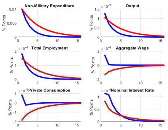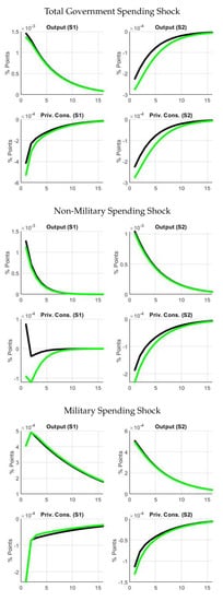 Focusing on the model with non-military and military expenditures, we noted remarkable differences across the two sub-samples and between the two components. Firstly, we noted that the volatilities of the government spending components were larger in the first sub-sample. Secondly, we found that civilian spending shocks were more persistent in S2, whereas the opposite occurred to military expenditure shocks. Thirdly, our results showed that was almost double of in both S1 and S2. Such findings confirmed that military spending shocks were much more volatile than civilian shocks. Similarly, military expenditure shocks were more persistent than civilian spending shocks in both sub-samples.