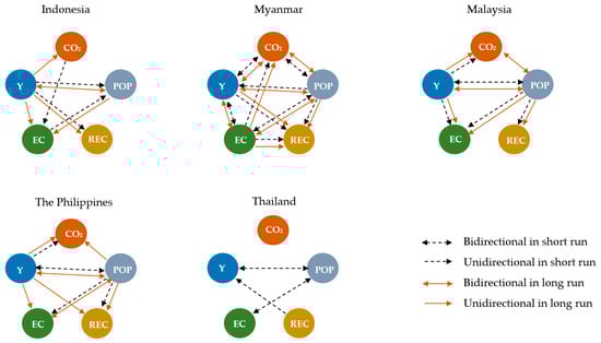 Summary of Granger causality tests. CO2—per capita CO2 emissions; EC—per capita energy consumption; Y: real per capita GDP and its square form; POP—population growth rate; REC—per capita consumption of renewable energy.