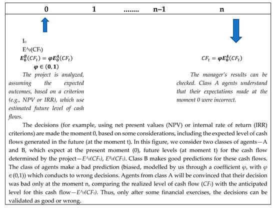 The decisions made by the management (DECt) are right for the period [−t, 0]. They are determining a stock of wealth for shareholders, which can induce in shareholders a status of safety and also a state of trust for the manager’s performance. A company’s return is, to a large extent, the effect of some decisions made in the past. As an effect, investors can judge one manager’s performance (the return in one year, source for dividend payments) even if this is the effect of the choices made in the past. Moreover, even the results of some projects are not desirable from a financial viewpoint, in real life their effects are combined with the other projects’ effects, finally, the shareholders having access only to some synthetic indicators at the company’s level (like cash flows, net earnings or return on equity). The initial stock of wealth allows the management to make some wrong decisions because their impact is not fatal for the company.