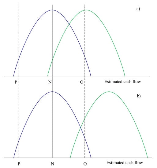 Two forecasts for future level of cash flows–for each class of agents—A (with green) and B (with blue). The two classes estimate the level of indicator (the estimated cash flow) through its probability distribution. The forecast made by one class of agents (B—in the left, with blue) is better than the second one (A—in the right, with green). In (a), if the realized cash flow is N (from normal, very plausible for the first class of agents’ forecast), it can be interpreted by the second class of agents as an unfavorable scenario of evolution (but still plausible, according to their forecast). A realized cash flow equal to O (from optimistic) should confirm the good forecast made by class A (even it is only a relatively unusual good performance based on the forecast made by class B). (b) depicts an even greater dissonance between the two forecasts. In this case, if the realized cash flow is N, class A can realize that the forecast was indeed wrong, but, also, they can consider that an extreme event occurred.