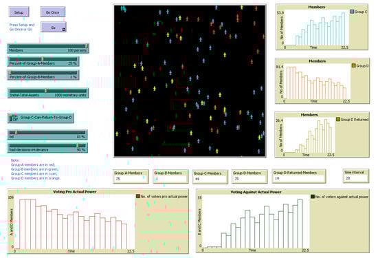 We have chosen the agent-based modelling for representing, analyzing and simulation of this situation as in this type of modelling, each agent, representing a shareholder, can be endowed with a series of properties that makes it unique comparative to the other agents. Even more, as each different groups of shareholders have different expectations and points of view related to the company’s efficient management, the inter-group properties of these agents are easy to model and represent. Even more, the NetLogo software offers a specific tool which enables one to conduct several experiments under different conditions and to observe, in real-time, the agents’ behavior, as individuals and as a part of a particular group.