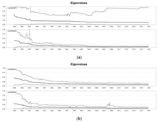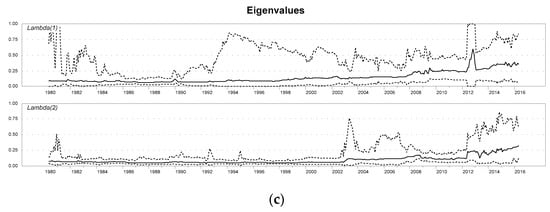The Eigenvalue Test U.K.–U.S. case. (a) Test for lambda 1 and for lambda 2 Germany–U.S. case. (b) Test for lambda 1 and for lambda 2 Japan–U.S. case. (c) Test for lambda 1 and for lambda 2.