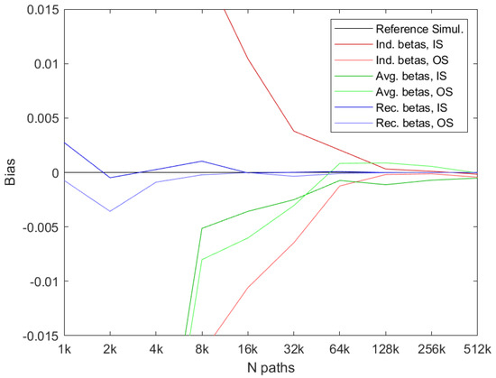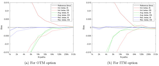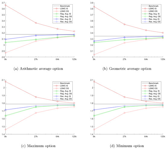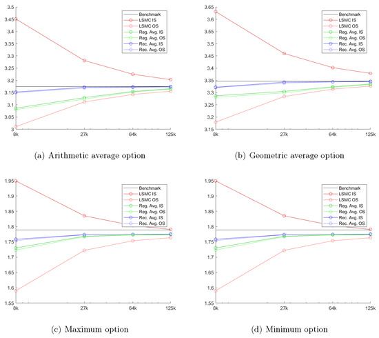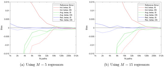 To demonstrate further our method’s robustness, Figure 8 shows the corresponding price estimates when the maximum order of the complete polynomial is , in which case a total of 816 regressors are used in the cross-sectional regressions. It is possible that by using other regressors, e.g., functions of the maximum asset value, than the complete set of polynomials, better results could be obtained with less regressors; however, for consistency and simplicity, we chose to stay with monomials as the basis. The figure shows that when M is increased, the asymptotic bias, apparent when using a very large number of simulated paths N, decreases, and this is particularly so for the maximum and minimum options. Note though that for all payoffs, our proposed bootstrapping method again continues to perform the best and deliver price estimates with the lowest bias of all the methods reported.