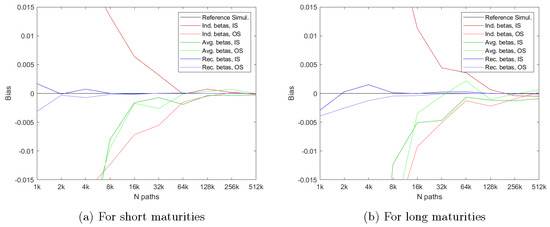 In addition to N being a choice parameter for the LSM method, so is M. In Figure 3, we plot equivalent results to those in Figure 2, but using and , respectively. The first thing to notice is that the two plots in Figure 3 show a pattern that is very similar to that obtained when using in Figure 2. For example, the LSM method is high biased when using IS pricing and low biased when using OS pricing with , as well as with . Figure 3, however, does indicate that these biases are larger for a given value of N when than when . This is expected since the degree of overfitting increases with M. This also affects the method that averages the optimal early exercise boundaries somewhat, although our bootstrapping method is much less effected. In particular, our proposed method works very well for both and , even when a low number of simulated paths, N, is used in the simulation.