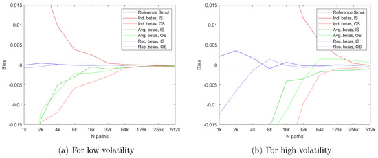 Figure 6 shows the performance of the three methods for an option on an asset with a low volatility of in the left hand plot and for an option on an asset with a high volatility of in the right hand plot. Again, the first thing to notice is that the two plots in Figure 6 show a pattern that is very similar to that obtained for the option on an underlying asset with a volatility of in Figure 2. Figure 6 does indicate, though, that the biases in the LSM method are larger for a given value of N when the volatility of the underlying asset increases. However, our proposed method continues to work very well, and much better than the regular LSM method, for both options on low and high volatility assets even when a low number of simulated paths, N, is used in the simulation.