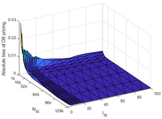 Figure 9 shows that the quality of the approximation of the estimated early exercise boundary very quickly improves, reflected in decreasing absolute bias of the estimated price, as and increase. In fact, if as little as repeats and 10,000 simulated paths are used, the OS bias is very small, and when repeats and 50,000 simulated paths are used, it is essentially eliminated. Note that estimating the optimal early exercise boundary with repeats and 10,000 simulated paths can be done in roughly the same time as running the regular LSM method once with 100,000, a number typically used.12