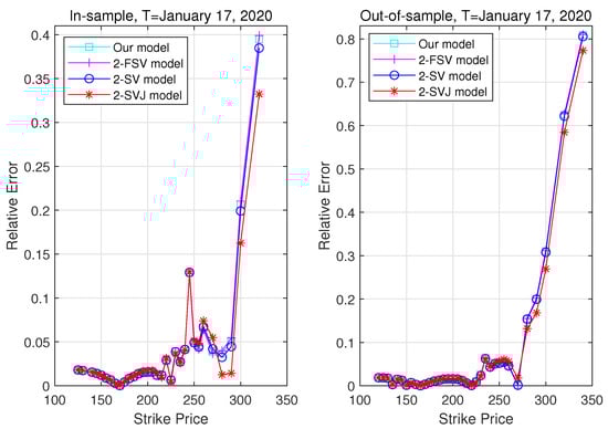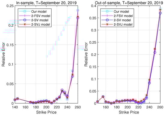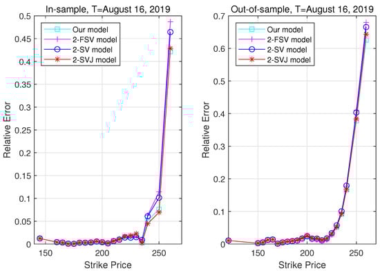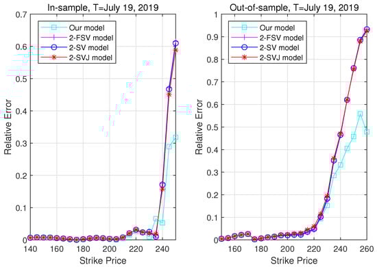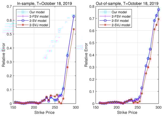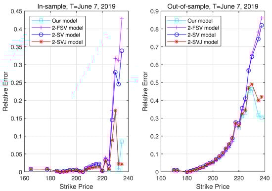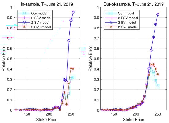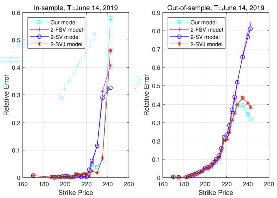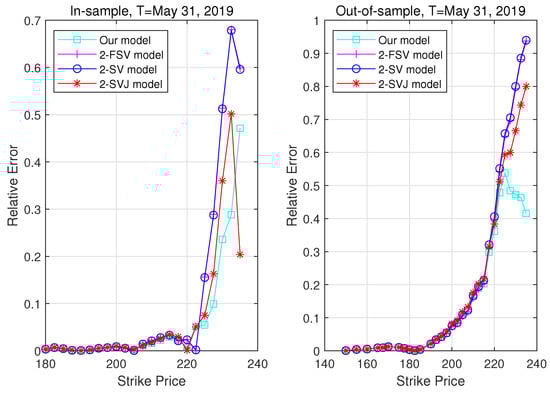 Figure 1, Figure 2, Figure 3, Figure 4, Figure 5, Figure 6, Figure 7, Figure 8, Figure 9 and Figure 10 exhibit the predicted prices of the four model specifications and market prices listed on 9 May 2019, with 11, 16, 21, 26, 31, 51, 71, 96, 116, and 181 trading days to expiry, respectively. Here, the predicted prices (out-of-sample pricing) were calculated by the in-sample calibration parameters reported in Table 1. One can clearly observe from the left panels of Figure 1, Figure 2, Figure 3, Figure 4, Figure 5, Figure 6, Figure 7, Figure 8, Figure 9 and Figure 10 that the option prices obtained by theoretical models were generally closer to the market prices for different strike prices. To further investigate the pricing performance of the four models, the right panels of Figure 1, Figure 2, Figure 3, Figure 4, Figure 5, Figure 6, Figure 7, Figure 8, Figure 9 and Figure 10 show the relative price differences (relative errors) between the theoretical model prices and market prices.5 For simplicity, we refer to a call option as deep out-of-the-money (DOTM) if ; out-of-the-money (OTM) if ; at-the-money (ATM) if ; in-the-money (ITM) if ; and deep in-the-money (ITM) if . Moreover, we considered options less than 60 days to expiration as short term; options with 60–120 days to expiration as medium term; and options larger than 120 days to expiration as long term. For the options with 11, 16, 21, 26, 31, and 51 trading days to expiry, the relative pricing errors produced by our proposed model were all significantly lower than those of 2-FSV, 2-SV, and 2-SVJ models in the case of DOTM options, while the relative errors of all models were slightly higher.