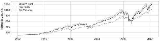 Due to the ability to enforce diversity, risk parity achieves neither minimum risk nor maximum returns and it is shown by Maillard et al. (2010) that the performance lies between the minimum-variance and the equal weight portfolio. An in-sample analysis was conducted over a 20 year period on a 50-asset set and plotted in Figure 1. This plot demonstrates how risk parity takes advantage of riskier assets much like an equal weight portfolio and produces returns above minimum variance. This trend is reversed in market crashes seen immediately following the 2008 market crash where equal weight and risk parity portfolio losses converge below the minimum variance portfolio due to added weight in the higher risk assets.
