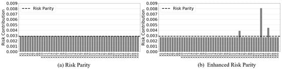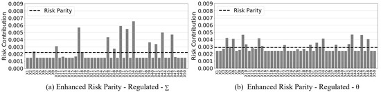 Using is restricting a large portion of the total portfolio risk from being influenced by individual assets. A smaller restricts investing in assets whose individual assets are high. Constraint (28) is using the diagonal of the VCV which limits how much of the total portfolio variance is coming from individual variances. It is placing a limit on the total portfolio variance to avoid most of the variance being influenced by these high return assets. This further distributes the risk across the remaining lower variance assets based on the asset correlations. The model still accounts for all asset-to-asset correlations in mechanism (23), while in (28) is the mechanism that limits any assets with high variance from getting too much weight. As compared to using the VCV matrix in the regulating term in Figure 4a, Figure 4b uses the construct to further distribute the risk across the assets and closer to risk parity allocations. The risk bound target for risk parity has increased, as indicated by the dashed horizontal line, because the total portfolio risk has increased due to the restriction from finding lower variance portfolios using all available interaction effects. This must be accepted when using the relaxed risk parity optimization in this form.