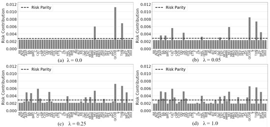 Increasing the penalty increases the magnitude of the regulating term . The progression of risk allocation in Figure 5 across various penalty values is presented. Note the change in risk concentration, as the multiplier is increased to 1.0. As the penalty value is increased in magnitude, the risk allocations begin too distribute further across the portfolio assets. The size of this can be set to find better performing near-risk parity portfolios. Note that Figure 4b and Figure 5d both represent allocations at and would present the same result with the same target return. However, Figure 5d is targeting a 1.2× return, so the allocations of risk are greater to achieve this goal.