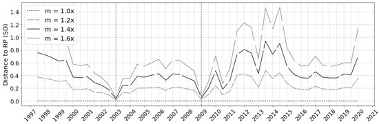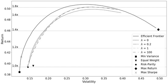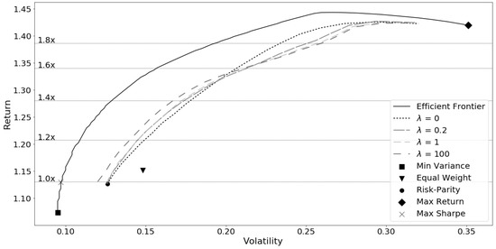 For this model there is a decrease in distance from risk parity, as seen in Figure 8, when . The portfolio becomes nearer to risk parity with up until a 1.6x target return goal. Within this range of return and penalty , the practitioner can expect an improvement in the risk parity properties for an enhanced portfolio over an un-regulated model. The plot reveals at that the underlying risk parity model is violated at a target return multiplier m = 1.0x, where the distance to risk parity is much greater than zero. This is confirmed by the data in Table 3 and indicates that the model cannot find risk parity portfolios at the same target return as risk parity with high lambda values. Using would never be advised or used in practice and is here to demonstrate a natural limit to the parameter before the underlying risk parity is affected—this appears to be from Table 3. This agrees with the plot in revealing values of less then one to produce superior results.