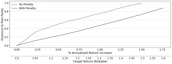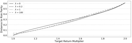 By increasing the penalty strength values beyond , the underlying model deviates from the risk parity, as seen when . The portfolios find more extreme concentrations and efficiency is traded for better dispersion of risk towards risk parity. This behavior is pronounced in a bull market where the model takes advantage of the better performing assets to find higher returns. The bull market period frontier represented in Figure 7 reveals that the benefits of the model are strengthened during strong markets. An increasing penalty moves the relaxed risk parity frontier away from the risk parity frontier producing higher returns for the same level of risk. This is a positive trait, the closer the portfolio is to risk parity the less the risk parity traits and variance are in conflict, so a properly chosen penalty lambda can take advantage of some of the better performing assets. Conversely, as the return target R becomes more aggressive, the portfolio losses efficiency, such as when m = 1.6x. At higher returns, there is a greater deterioration of the model’s performance due to concentration of assets. Above this point, the model’s performance aspects take precedence and the penalty loses its effectiveness to target near-risk parity portfolios. The distance from risk parity is affected by both the target return and the penalty strength and can be observed in Figure 8 spanning various target returns. This plot indicates the average distance to risk parity in-sample for the increasing target return multiplier m.