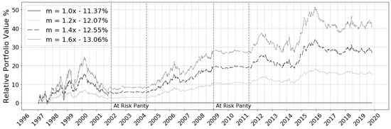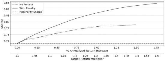 Both tables indicate that a penalty produces smaller distances to risk parity and improved Sharpe ratios indicate that enhancing risk parity is possible using portfolios near risk parity. The Sharpe ratios do not always improve over an un-regulated model ( = 0) at higher target returns, but this is not the primary goal, rather the reduction in distance to risk parity is. Specifically, in a bull marker period in Table 4, the Sharpe ratio can be seen to improve up until the target m = 1.2x when .