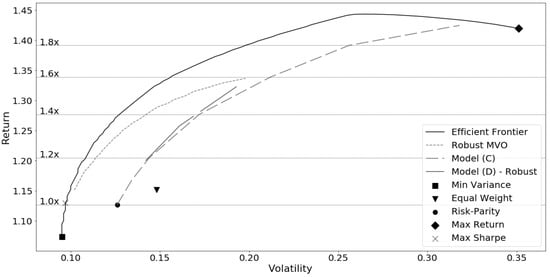 A range exploration strategy is employed for model parameter estimation. To facilitate the out-of-sample analysis, the hyper-parameter is fixed for a penalty strength that achieves a balance between distance to risk parity and performance. A grid-search is carried out across increasing penalty strength and target return multipliers. As determined in Section 4, the penalty affects how the relaxed risk parity model frontier approaches the efficient frontier. Reasonable gains can be made with appropriate tuning between zero and one. Values of are too strong and concentrate risk through over-penalization. A strong penalty over-penalizes each individual risk asset and results in portfolios that are no nearer to risk parity. A 1 value indicates that a reduction in strength of the regulating term achieves a better result. Table 5 results indicate a low penalty strength of in Model (B) and produces the smallest distance to risk parity across the various return levels and will be used in the remainder of this study.