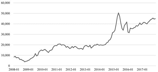 The main sample data, retrieved from the Wind Database, were for China’s A-share stocks that were traded on the Shanghai Stock Exchange (SSE) and the Shenzhen Stock Exchange (SZSE) between January 2008 and December 2017, over a total of ten years. The use of a longer period causes the scale of the sample to shrink. Moreover, this period includes a steady state (from March 2011 to July 2014), a bullish period (from July 2014 to June 2015) and a bearish period (from June 2015 to February 2016). The Wind Database is a reliable database widely used in the Chinese financial industry. The trading interval of the data is a calendar quarter. Thus, there are 40 intervals for the ten years of data. SSE and SZSE are two stock exchanges in mainland China. SSE is positioned as the main board market, mainly for large companies while SZSE is positioned as a small and medium board market, mainly for smaller companies. Therefore, companies listed on SSE and SZSE include sufficient idiosyncrasies for our study. After removing stocks with missing data and defining financial firms, about 1200 stocks were selected for analysis. Since there were only 1494 listed companies in the A-share market until the end of 2007, the fraction of coverage exceeded 78%, roughly representing the majority of the market; thereby the result can be generalized to the whole market. Figure 1 presents the trend of tradable market capitalization from January 2008 to December 2017.