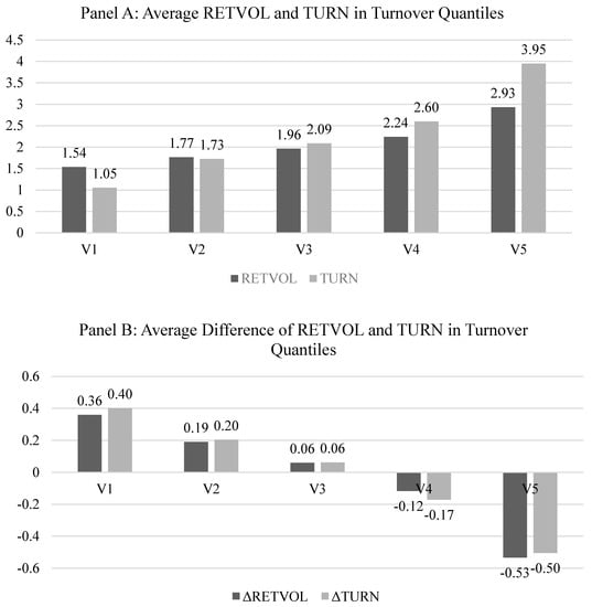 Figure 3 displays time-series averages of the measure for divergence of opinion for portfolios. Stocks are classified into five groups to represent five intervals of turnover quantiles. In panel A, RETVOL is the standard deviation of excess daily return relative to the market return over the (−10, −1) window prior to the earnings announcement date. TURN is the average daily turnover over the same period as RETVOL. TURN and are multiplied by 100 in order to fall in the similar range of RETVOL and . In panel B, is the difference between the RETVOL over the (1, 10) window and the (−10, −1) window. We used the CAR sample for this analysis, which includes 1283 stocks and is larger and more complete than the SUE sample.