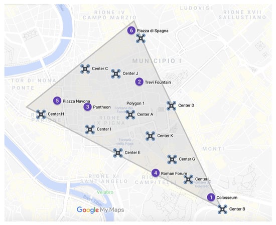 Within Rome, attraction sites are heterogeneous in that some areas are considered more attractive than others. The most attractive sites, usually called “hotspots”, highlight key aspects of Rome’s identity. The current study considers places with the highest numbers of visitors accessible for virtual drone visitations as “hotspots”. Selected hotspots include the Colosseum, Trevi Fountain, Roman Forum, Pantheon, Piazza di Spagna and Navona. Figure 1 demonstrates a triangular zone which comprises top-rated tourist attractions in Rome and candidate locations for drone centers. Candidate locations are selected according to the optimal distance from the hotspots.