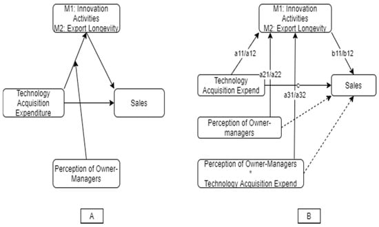 Table 3 presents the ordinary least square regression results with all variables mean-centered except owner-managers’ perception of formal financing access. Regression coefficients and represent the direct correlation between the predictor factor and the two mediating variables. The effect of the capital ‘budget’s proportion spent on acquiring new technology on the two mediators (M1&M2) is significant. The planned expenditure relates positively to the two mediators and is statistically significant as there is no zero within the confidence interval boundaries—to innovation-related activities ((1.2603; 0.4360, 2.0846) and export longevity ((2.6808; 1.8675, 3.4943). The regression coefficients and estimate the perception of the owner–investors’ effect on the innovation-related activities and export longevity when there is no allocation for new technology acquisition in the capital budget. Perception affects innovation negatively, but this is not statistically different from zero (( −0.40590.4059; −1.1921, 0.3804). Still, the owners–investors perception of the availability of formal credit positively influences export longevity; however, the relationship remains statistically insignificant ( 0.0732; −1.0959, 1.2423).