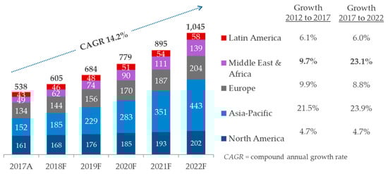 Current and forecasted non-cash transactions by region for 2017–2022, in billon transactions, (A) actuals and (F) forecasted. Non-cash transactions here are defined as all electronic payments, debit and credit cards transactions, bank transfers, and cheques (Capgemini 2019).