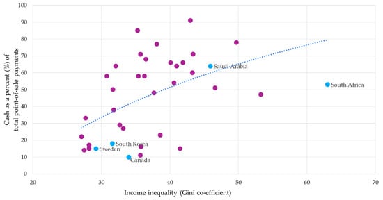 Value of total payments transacted in cash versus income inequality for 37 emerging and advanced economies, 2019. The Gini coefficient for Saudi Arabia relates to 2014 and was obtained from the World Bank’s World Development Indicators. The countries included in the sample are listed in Appendix A (UNDP 2019; FIS 2020).