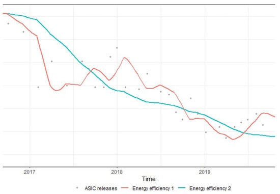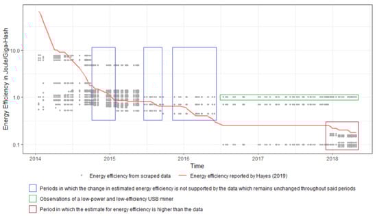 One of the most important parameters of the CPM described by Equations (1)–(3) is the energy efficiency of the mining equipment for the whole Bitcoin network. Finding a reliable estimate for this parameter is a very challenging task due to the scarcity of data for most mining pools, if not the complete lack of data. () computed this parameter by extracting energy efficiency data from Bitcoin mining hardware manufacturer websites and by checking them against a dedicated wiki page that catalogs the efficiency of the mining hardware (https://en.bitcoin.it/wiki/Mining_hardware_comparison). He then …“collected these data for each date of difficulty change in the Bitcoin network, scraped from the web using the internet archive’s wayback machine”. The network energy efficiency was finally computed using a power log-function applied to these data3. We tried to replicate and extend the Hayes’ estimated energy efficiency by web scraping data from the previous “Mining hardware comparison” webpage. However, when we overlaid the energy efficiency estimated by () with the scraped ASIC data, we found some anomalies, see Figure 2: at the end of 2015 and until the beginning of 2016, the estimated energy efficiency suddenly changes but the ASIC release data do not. Moreover, during the first months of 2018, several new releases were introduced but the estimated energy efficiency always stays above these releases. Furthermore, there is a line of violet dots constant at 1 Joule/GH which corresponds to USB miners, which are no longer competitive products but they still seem to be included in the computation of the energy efficiency even in 2017–2018.