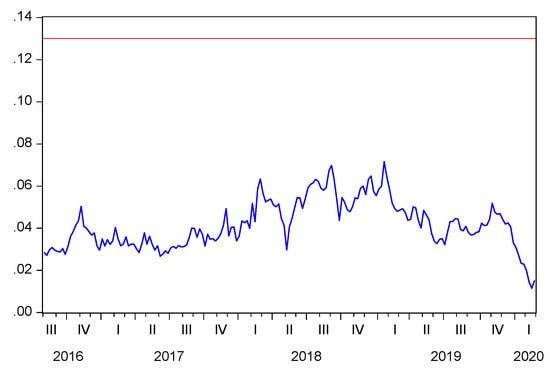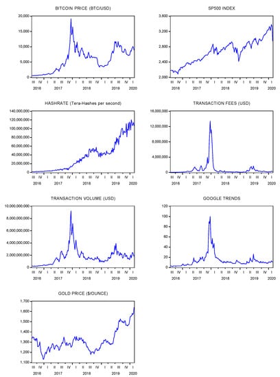 The dataset examined in this paper consists of weekly data ranging from 1 August 2016 till 29 February 2020: similarly to (), we transformed the original daily data into weekly averages to avoid potential issues related to autocorrelation. The motivation for such a time sample was to get the most recent data but, at the same time, to avoid any bitcoin halving events: as we discussed in Section 3.3, the nature of these events is unique and should be studied separately.