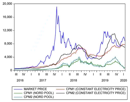 The CPMs computed using the Nord Pool electricity prices and the two energy efficiency curves presented in Section 3.1 as well as the CPMs computed with constant electricity prices are reported in Figure 8, together with the bitcoin market prices.
