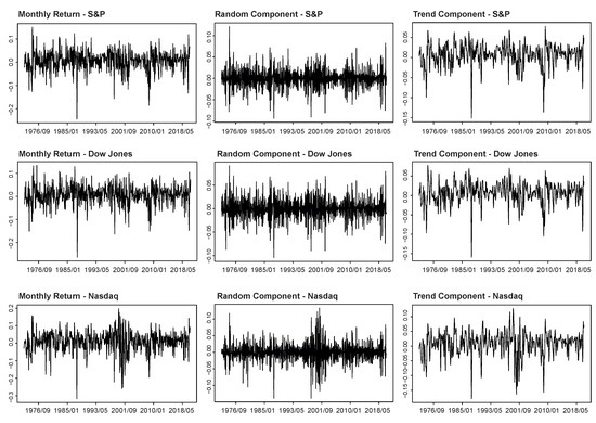 Monthly returns and trend and random component decompositions.