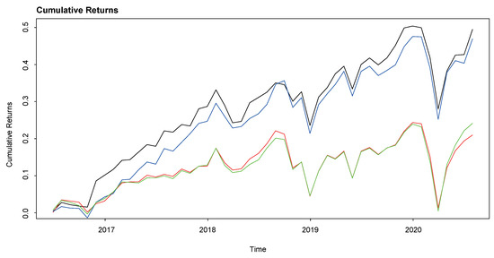 Out-of-sample cumulative returns of the four portfolio strategies analyzed: in black the minimum-variance portfolio from the deep neural network (DNN), in green the minimum-variance portfolio obtained from GARCH forecasts, in blue the mean-variance portfolio obtained from a DNN, in red the mean-variance constructed from GARCH forecasts.