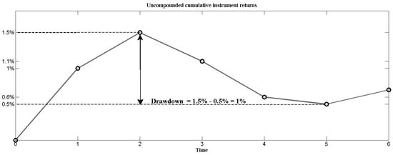 At time t, the drawdown is the loss of the instrument, since a peak of that occurs within the -window ( for and for ). If at time t, the cumulative rate of return is the highest on , then . The drawdown is always nonnegative and is often referred to as underwater curve. It is zero for all time moments only if returns are nonnegative for all period. See Figure 1 for the illustration of the drawdown definition (the figure is borrowed from ()).