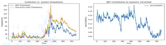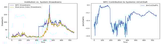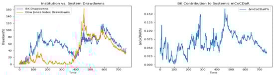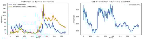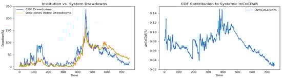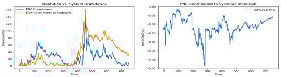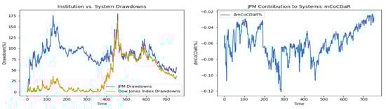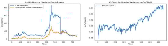 Furthermore, we plot time dependent drawdowns and mCoCDaR contributions; see Figure 2, Figure 3, Figure 4, Figure 5, Figure 6, Figure 7, Figure 8, Figure 9, Figure 10 and Figure 11. Each institution graph on the left plots its drawdown curve in blue versus the orange curve showing drawdowns of the Dow Jones index in the same time period, both based on cumulative uncompounded returns on a weekly basis. Every graph on the right plots fraction contribution to the total systemic risk from an individual bank. This fraction is obtained by normalizing individual contributions measured by described in Section 3.5. Normalization is done by dividing individual contributions by the total contribution from the ten banks. By construction, the normalized contributions sum up to one for each time step. As a result of applying the mCoCDaR regression setting, we observe that individual contributions significantly vary over time as well as across institutions. Moreover, risk contributions may have different signs. For instance, JPM and WFC always have negative contributions (see, Figure 2 and Figure 5). Citigroup starts with negative contributions and moves to contributing positively (see, Figure 4), while the others always have positive contributions.
