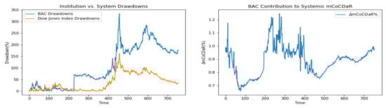 We performed a case study for the three proposed methods, CoCDaR, mCoCVaR, and mCoCDaR, using data from the ten largest banks and the Dow Jones Index, along with some state factors. The case study with codes and data are posted on the web. We have also reproduced the case study for CoCVaR measure from (), with corrected signs in the returns data. We compared the ranking of institutions based on contributions to system’s CoCDaR, mCoCDaR, mCoCVaR, and CoCVaR. The difference in applying CVaR- and CDaR-based measures is observed from quite different rankings of institutions. Multiple regression identifies key drivers in systemic risk because effects are marginalized. We compared time dependent curves of risk contributions for mCoCDaR and CoCVaR. Risk contributions based on CoCVaR are quite similar across institutions, while those based on mCoCDaR have very different patterns. These different patterns are implied by both the use of drawdowns and the use of multiple regressions.