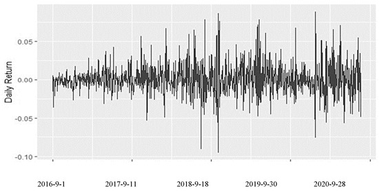 Moreover, log-returns during 2016–2020 are represented in Figure 1. We can observe that volatility changes tend to cluster financial returns over time, which is an indicator of long memory (See Figure 1). Namely, large changes tend to be followed by large changes, and vice versa—the small changes are followed by small changes.