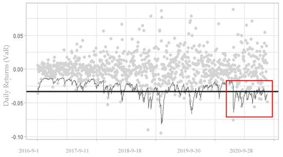 VaR Value of Daily Returns of the Stock Index in the Airport Shipping Set (31 August 2016–1 September 2020) Note: 1. The fluctuant curve is the VaR outcome of the GARCH model, while the thick black line is the VaR outcome of the normal distribution; 2. The red box represents the volatility of daily returns of ASSI during the COVID-19 period.