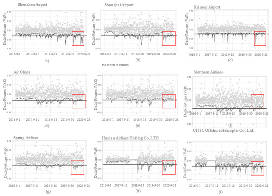 VaR Value of Daily Returns of the Stock Index in Airline Related Firms (Except for Stocks within No ARCH Effects, 31 August 2016–1 September 2020). Note: 1. The volatility curve is the VaR outcome of the GARCH model, while the thick black line is the outcome of the normal distribution; 2. The red box represents volatility during the COVID-19 period.