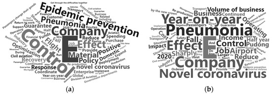 Depending on word frequency, word clouds show keywords within various sizes in Figure 5. The larger keywords are, the higher their frequencies are. From Figure 5a,b, We can quickly identify the similarities and differences between Shenzhen Airport and Shanghai Airport when these two firms faced COVID-19. The most frequent words are “epidemic” in the two firms, occurring 54 times in Shenzhen Airport as well as 41 times in Shanghai Airport, indicating that COVID-19 definitely has a serious impact on airport business. “Company”, “Effect”, “Pneumonia” and “Novel coronavirus” with higher frequencies shown in the word clouds also support these negative effects. More specifically, based on the semiannual financial reports, the pandemic had a severe impact on revenues and net profits. Compared to the previous numbers, the operating revenues were down 31.03% in Shenzhen Airport and 50.8% in Shanghai Airport year on year, and the net profits decreased by 149.16% in Shenzhen Airport and 114.29% in Shanghai Airport year on year. Therefore, the Word Cloud and semiannual financial reports further support our empirical results in Section 3.2 that COVID-19 caused stock volatility and has negative impacts on corporate businesses.