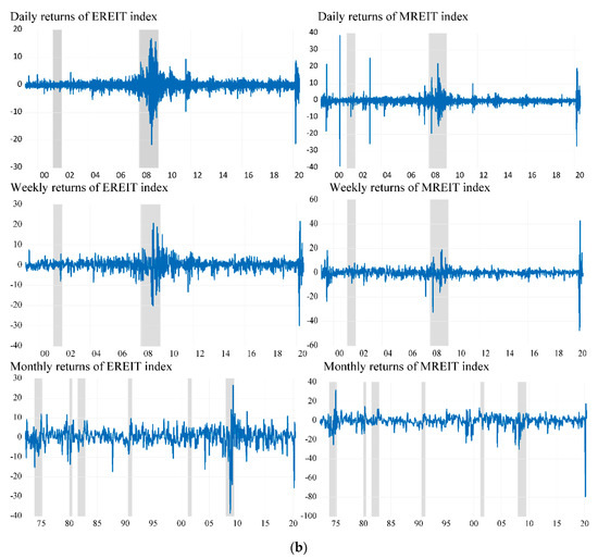 Since the sample period ends in mid-July, it is also interesting to observe the impact of the COVID-19 pandemic on the performance of REITs. The sharp decline in returns occurred in 2020M03. Both categories of REITs respond differently to recession shocks. For example, the daily returns of EREIT (MREIT) troughed at 21% (27%) in 2020M03. The weekly returns of EREIT (MREIT) troughed at 30% (47%) in 2020M03, while the monthly returns troughed at 38% (79%) during the same month. Generally, returns seem more volatile during periods of economic or financial turmoil. Unsurprisingly, the minimum returns are, in absolute terms, higher than the maximum returns, especially for monthly data, which cover additional recessionary and crisis periods compared to daily and weekly data. For example, the sharp decline in EREIT returns in October 1987 coincided with the Black Monday panic sell-off.
