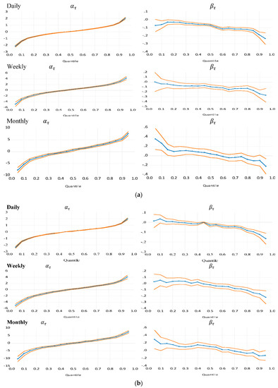 In Figure 5a,b, the general downward-sloping pattern of dependence coefficient estimate, confirms investors’ overreaction to the news. However, the recession coefficient estimate, is mainly flat for the daily returns in Figure 5a and daily, weekly, and monthly MREIT returns in Figure 5b. Furthermore, the daily and weekly returns exhibit a downward sloping pattern at the extreme upper tails coupled with an increase in the confidence interval of . This illustrates an increase in dispersion of returns triggered by higher risk-premium at the tails of the negative return distributions compared to the intermediate quantiles. The nearly flat, negative autoregressive structure of daily returns in Figure 5a,b suggests daily prices generally decline due to negative sentiment associated with recession. Indeed, the intercept is upward sloping in Figure 5a,b, but even when it is positive (positive sentiment), daily negative autocorrelation persists, suggesting that past negative investor sentiments dominate current positive sentiments in trading decisions.
