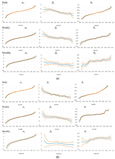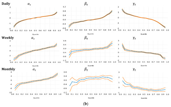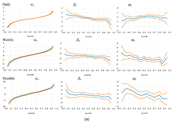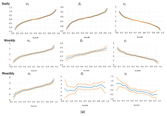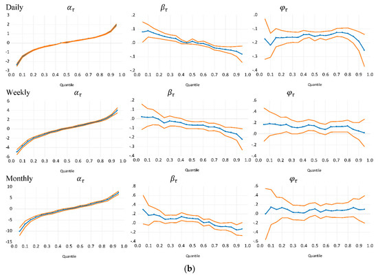 Graphically, Figure 2a,b display return dependence patterns. The middle “line and symbol” represent quantile coefficient estimates. The estimates, , measures the intercept (magnitude or the average daily, weekly, and monthly return per quantile) while is the slope coefficients in the QAR(1) model where ranges between 0.05 and 0.95. The two outer lines define 95% confidence bands for all quantile estimates.