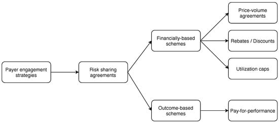 To reduce the financial risk borne by the payer, RSA (or so-called MEA or PAS) are being implemented. These contracts can serve several aims simultaneously, such as reducing the risk of outcome uncertainty, with the example of CEDs (cf. Section 3.2), and granting patient access for high-priced drugs (Ferrario and Kanavos 2015; Lu et al. 2015; Faulkner et al. 2016; Akhmetov and Bubnov 2017; Degtiar 2017; Lu et al. 2018). In Figure 2, based on the payer engagement strategies presented by Akhmetov and Bubnov (2017, Fig. 1), we lay out the schemes that primarily address the high cost of new drugs.
