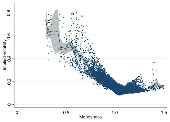 The empirical agenda of this paper is centered on testing the functional form of in Equation (10). Based on the testing framework in Section 2, let denotes the option implied volatility, denotes the option’s moneyness, and denotes the linear and quadractic term of time-to-expiration. We test